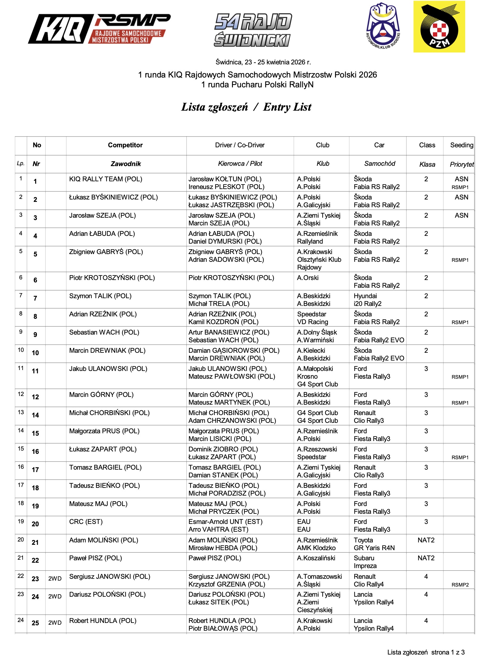 Listę uczestników 54. Rajdu Świdnickiego otwierają Jarosław Kołtun i Ireneusz Pleskot (Skoda Fabia RS Rally2). Drudzy wicemistrzowie Polski to najwyżej sklasyfikowana załoga poprzedniego sezonu w gronie zgłoszonych do inauguracyjnej rundy KIQ RSMP.