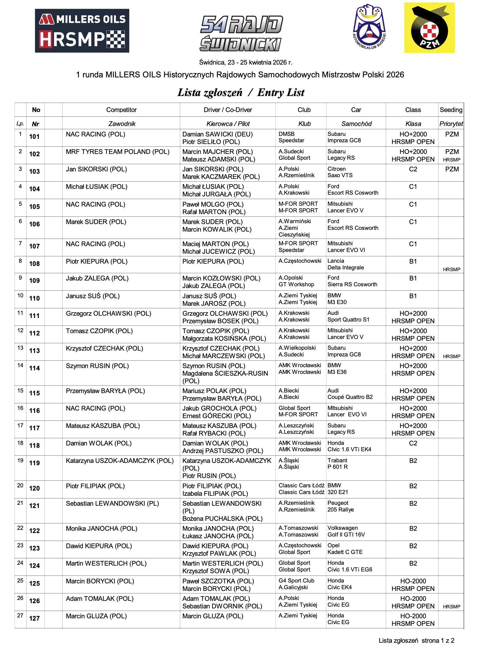 Stawkę historycznego czempionatu tworzy 29 duetów, z czego 13 zaprezentuje się w widowiskowych autach z napędem na wszystkie koła. W ramach rundy Millers Oils HRSMP będzie można zobaczyć w akcji m.in. takie samochody jak Ford Escort RS Cosworth, Audi Quattro, Mitsubishi Lancer Evo, Subaru Impreza, Opel Kadett czy też… Trabanta 601.