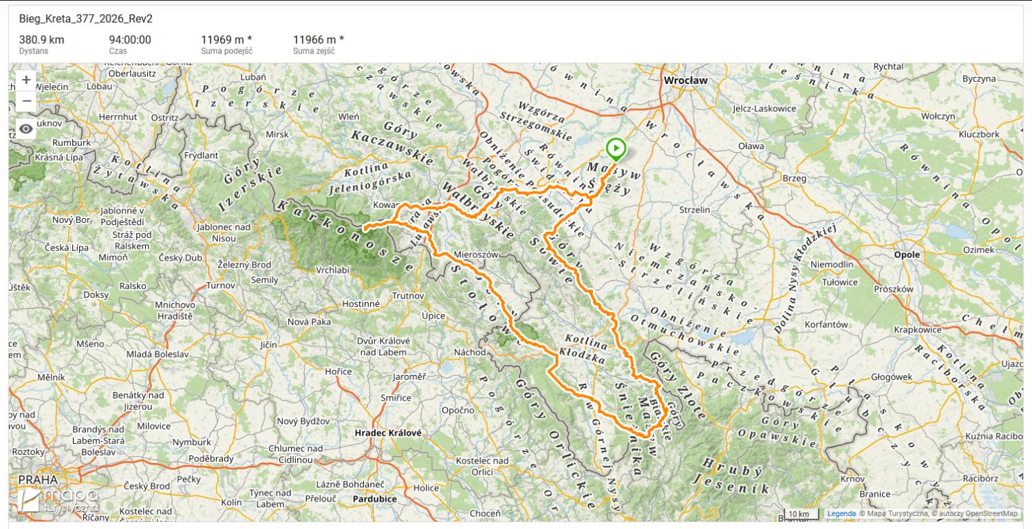 Bieg Kreta to najdłuższy ultramaraton w Polsce: 377 km, 12.000 m przewyższeń. Urozmaicona, trasa dla uniwersalnych biegaczy, od szybkich płaskich odcinków asfaltowych, po strome ścieżki najwyższych sudeckich szczytów czy skalne labirynty Gór Stołowych. Do tego błoto, śnieg i lód. Ciągły napór, dzień i noc, aż do końca.