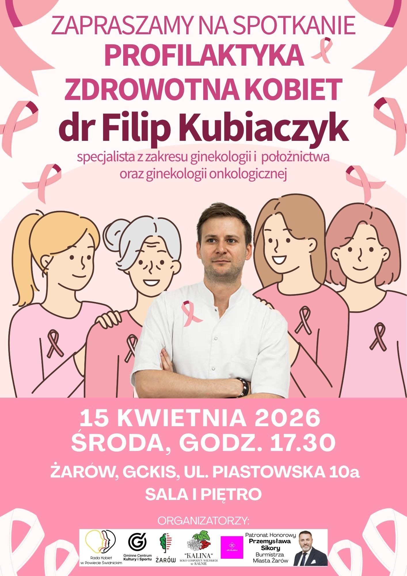 Spotkanie jest bezpłatne i odbędzie się w środę, 15 kwietnia 2026 roku o godz. 17.30 w Gminnym Centrum Kultury i Sportu w Żarowie (ul. Piastowska 10a, I piętro). Podczas spotkania poruszone zostaną najważniejsze zagadnienia związane ze zdrowiem kobiet, w tym profilaktyka chorób, znaczenie regularnych badań, zdrowie hormonalne, a także właściwe nawyki wspierające dobre samopoczucie i kondycję organizmu. Spotkanie będzie miało charakter otwarty i edukacyjny, uczestniczki będą miały możliwość wysłuchania specjalisty, ale także zadawania pytań.