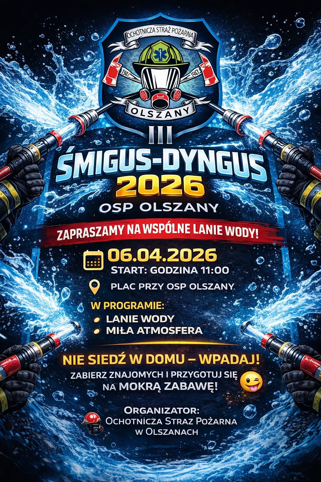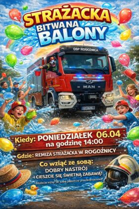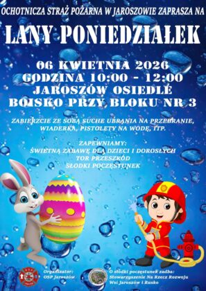Śmigusa-dyngusa organizują też strażacy z OSP Jaroszów. Zabawa potrwa od godziny 10.00 do 12.00. Lokalizacja: Jaroszów Osiedle – boisko przy bloku nr 3. – Czeka na Was: świetna zabawa dla dzieci i dorosłych, tor przeszkód, słodki poczęstunek dla najmłodszych, strażacki klimat i dużo wody! Zabierzcie ze sobą: suche ubrania na przebranie, wiaderka, pistolety na wodę i dobry humor! Widzimy się na miejscu – będzie mokro, wesoło i bezpiecznie! – zapraszają.