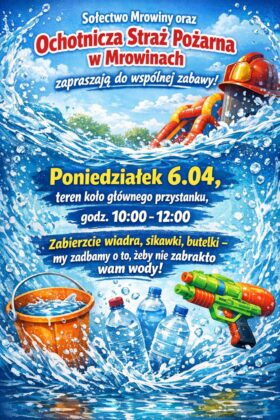 Wody nie zabraknie też na imprezie szykowanej przez OSP Mrowiny. – Zapraszamy mieszkańców do wspólnej zabawy w poniedziałek 06.04.2025 o godzinie 10:00 na plac koło przystanku w Mrowinach – zachęcają druhowie.