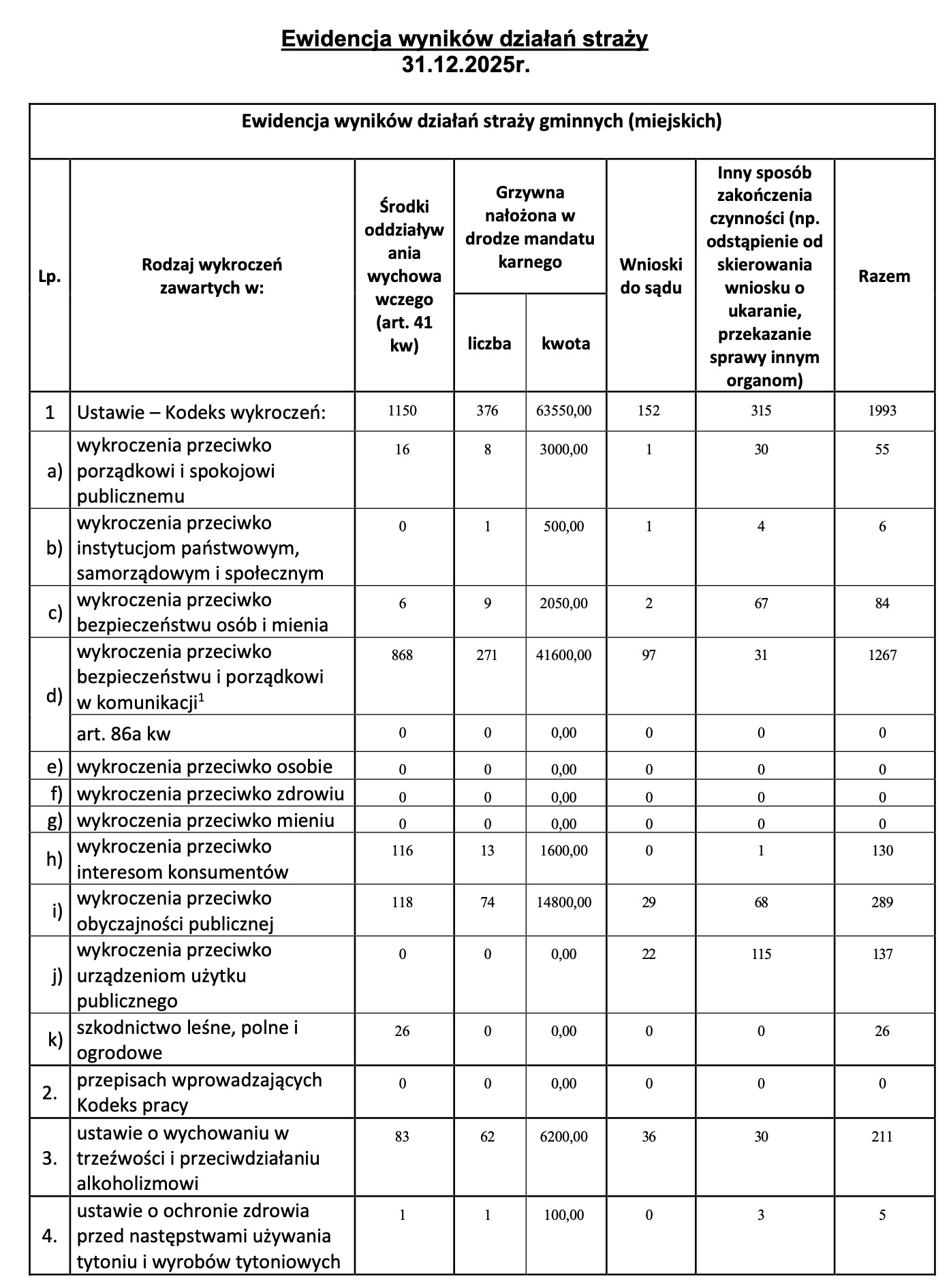 W sumie w 2025 roku municypalni nałożyli 450 mandatów na łączną kwotę 72 900 złotych. Najwięcej z nich wystawiono w związku z wykroczeniami komunikacyjnymi – 271 mandatów na kwotę 41 600 zł. Za wykroczenia przeciwko obyczajności strażnicy nałożyli 74 mandaty na kwotę 14 800 zł, w przypadkach związanych z łamaniem ustawy o wychowaniu w trzeźwości wystawiono 62 mandaty na kwotę 6200 zł, natomiast 13 mandatów na kwotę 1600 zł dotyczyło wykroczeń przeciwko interesom konsumentów. 1254 razy strażnicy ograniczyli się do pouczeń, a 196 razy kierowali wnioski do sądu.