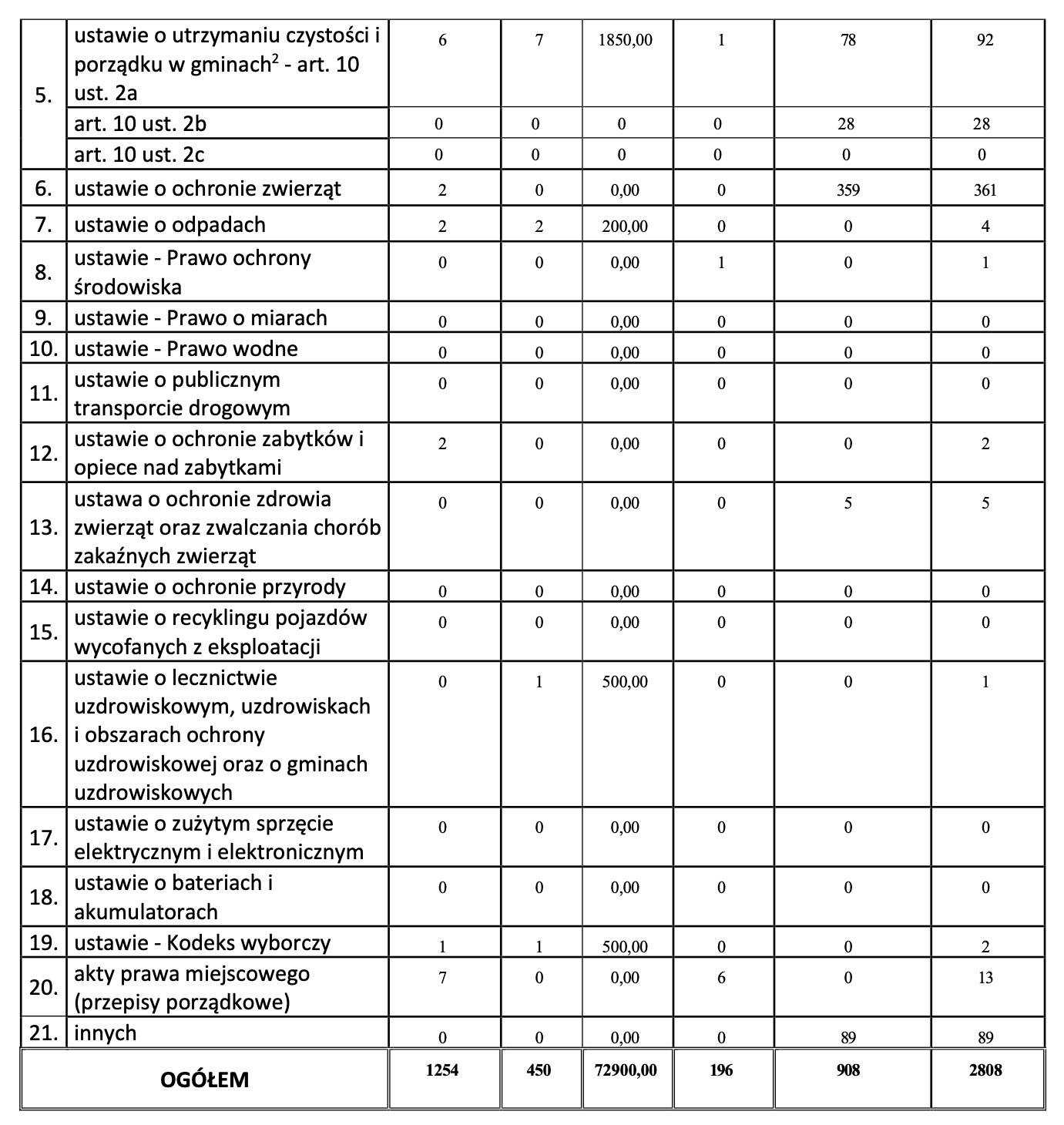 Wspólnie z pracownikami wydziału gospodarki odpadami strażnicy przeprowadzili też 53 kontrole deklaracji śmieciowych, w wyniku których nałożono 6 mandatów karnych, 5 osób pouczono, a 27 spraw przekazano do dalszego prowadzenia przez inne instytucje. –Działania nasze nie są ukierunkowane na represjonowanie sankcjami karnymi osób niestosujących się do przedmiotowych przepisów lecz ich pouczanie, uświadamianie i wskazywanie nieprawidłowości w tym zakresie – zaznacza Fiłonowicz.