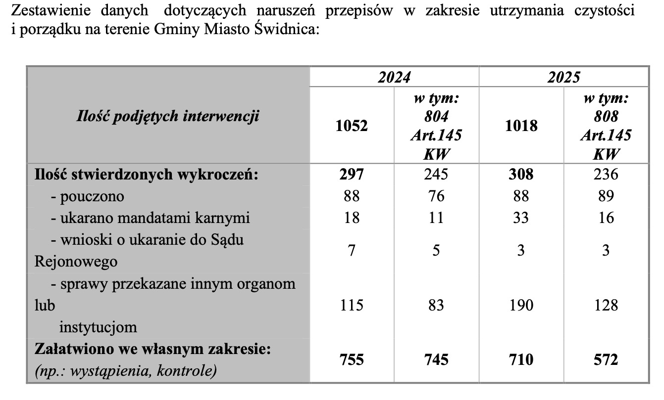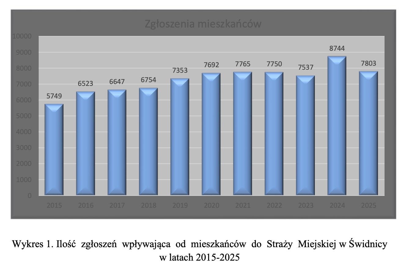 29 maja 1991 roku ówczesny prezydent Świdnicy Jacek Drobny wydał zarządzenie o utworzeniu Straży Miejskiej w Świdnicy. Początkowo formację tworzyło dwunastu funkcjonariuszy, a pierwsze patrole pojawiły się na ulicach miasta 1 października 1991 roku. – Rok 2025 to kolejny rok z rzędu, w którym liczba interwencji na zgłoszenia mieszkańców utrzymuje się na bardzo wysokim poziomie. Z wszystkich sił staramy się sprostać oczekiwaniom społeczności lokalnej, która zwracając się do nas o pomoc, daje wyraz zaufania oraz potrzeby istnienia Straży Miejskiej w Świdnicy – podkreśla komendant Marek Fiłonowicz w dorocznym raporcie podsumowującym pracę municypalnych. W 2025 roku mieszkańcy zwracali się do funkcjonariuszy o interwencję 7803 razy. Rok wcześniej strażnicy otrzymali od Świdniczan 8744 zgłoszeń, natomiast w 2023 roku było ich 7537.