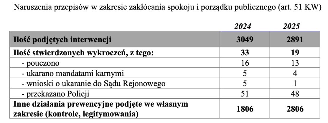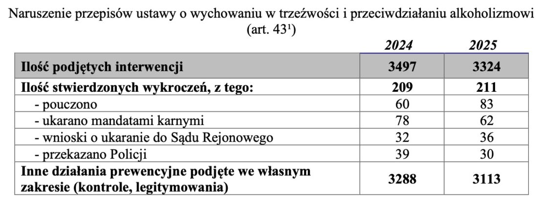 Strażnicy odnotowali nieznaczny wzrost liczby wykroczeń związanych z ustawą o wychowaniu w trzeźwości i przeciwdziałaniu alkoholizmowi (209 stwierdzonych wykroczeń w 2024 roku, 211 w 2025 roku). Zmniejszyła się z kolei liczba stwierdzonych wykroczeń w zakresie zakłócania spokoju i porządku publicznego: z 33 w 2024 roku do 19 w 2025 roku.