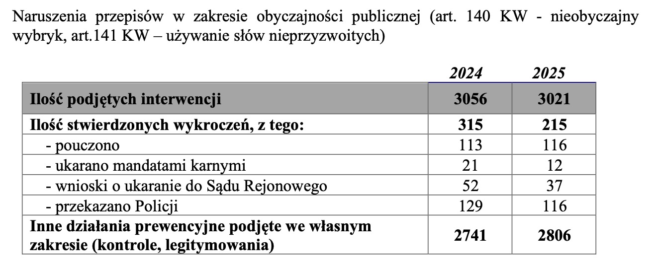 Według wyliczeń przedstawionych w rocznym raporcie, w 2025 roku zmniejszyła się liczba interwencji związanych z naruszeniem przepisów w zakresie obyczajności publicznej. W ubiegłym roku było ich 3021, a w wyniku podejmowanych działań ujawniono 215 wykroczeń. Dla porównania, rok wcześniej strażnicy podjęli w tym zakresie 3056 interwencji, które w 315 przypadkach zakończyły się stwierdzeniem wykroczenia.