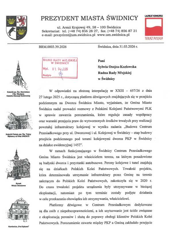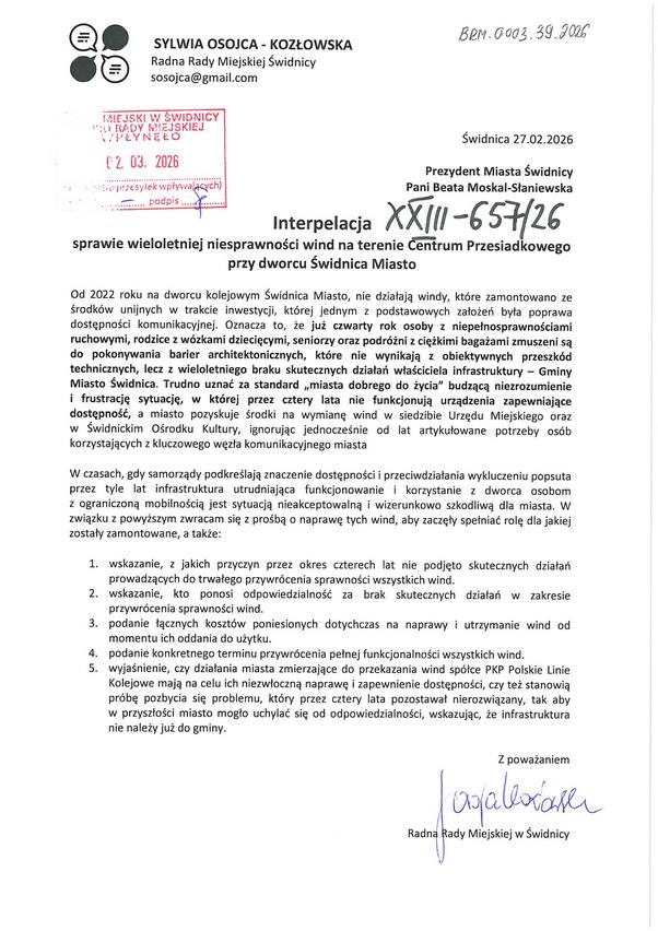 „Od czterech lat nie działają windy na dworcu Świdnica Miasto, które są własnością Gminy Miasto Świdnica i za które odpowiada miasto, nie kolej. Opiekuje się nimi, podobnie jak budynkami Centrum Przesiadkowego i infrastrukturą z nimi związaną Miejski Zarząd Nieruchomości. Pod koniec lutego br., po spotkaniu z grupą mieszkańców, interweniowałam w sprawie wind po raz kolejny składając w tej sprawie interpelację. Niesprawność tych dźwigów uważam za poważny problem społeczny, ale i wizerunkowy naszego miasta.
