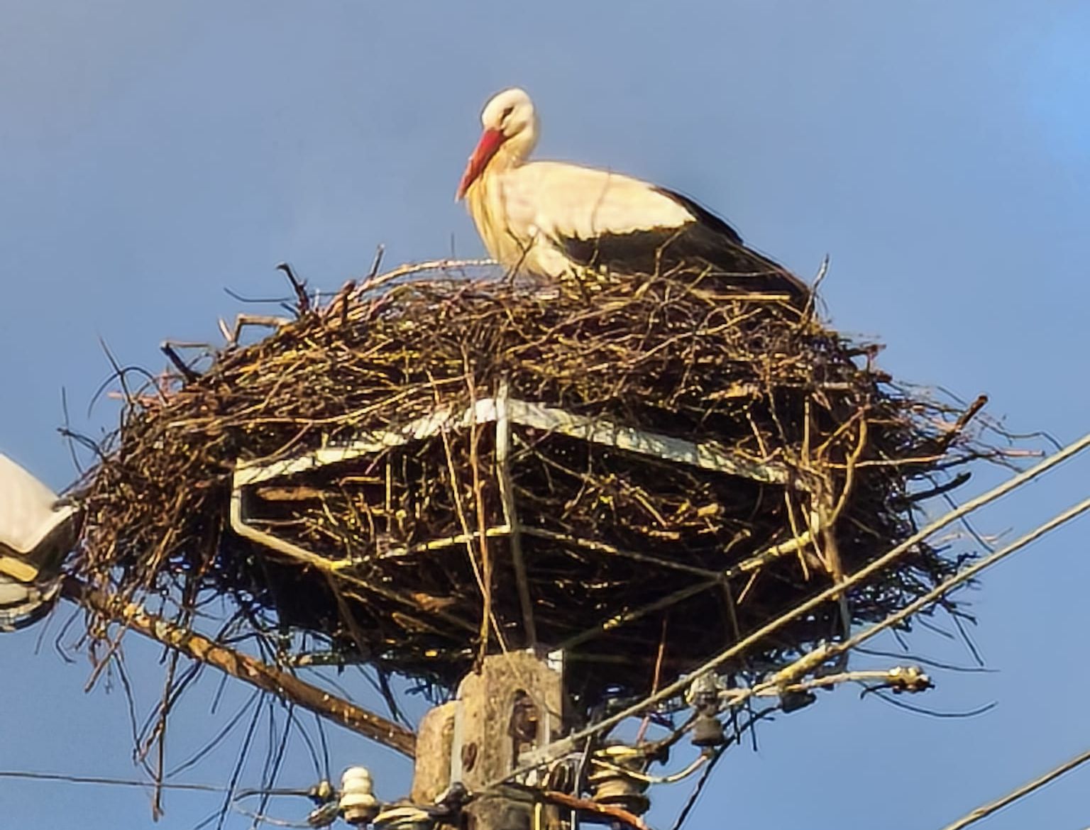 W 2025 roku bociany przyleciały 11 kwietnia i od razu zabrały się za zagospodarowanie nowego domu, który pieczołowicie uzupełniały patykami. Latem doczekały się jednego potomka.