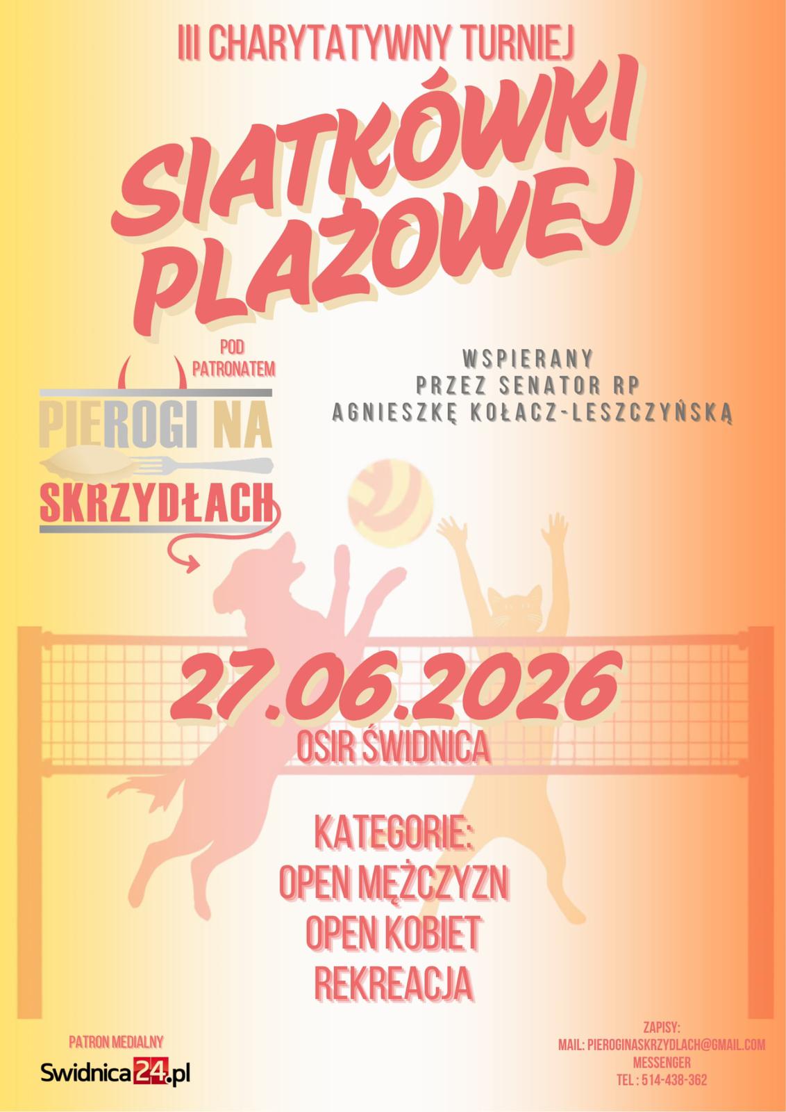 Na ostatnią sobotę czerwca zaplanowano trzecią edycję Charytatywnego Turnieju Siatkówki Plażowej pod patronatem Pierogów na Skrzydłach. Impreza przeprowadzona będzie w trzech kategoriach, patronem medialnym jak zawsze portal Swidnica24.pl.