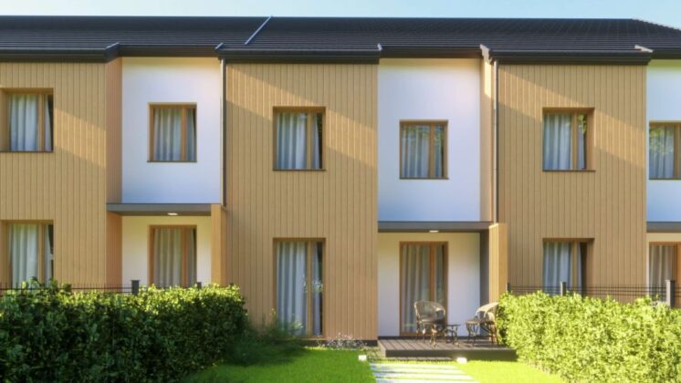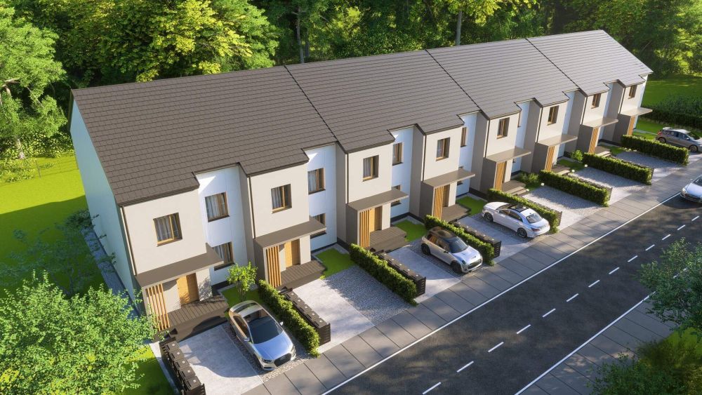 Każdy z domów posiada własny indywidualny grunt. Przed domem ogródek wykorzystano: na dwa miejsca parkingowe z możliwością ładowania akumulatorów; miejsce na rowery; miejsce na śmietniki do segregacji; miejsce na niewielką zieleń. Do domu wchodzi się przez otwarty ganek.