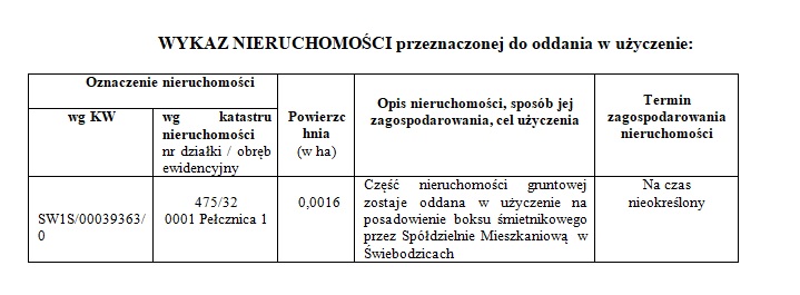 Wykaz został wywieszony na tablicy ogłoszeń Urzędu Miejskiego w Świebodzicach (ul. Rynek 1) oraz zamieszczony na stronie internetowej: www.swiebodzice.pl i www.bip.swiebodzice.pl, od dnia 03.12.2025 r. do dnia 24.12.2025 r. Ponadto, informację o wywieszeniu tego wykazu podano do publicznej wiadomości przez ogłoszenie w prasie.